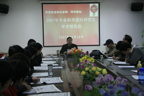 学术报告会正式开始之前,昝教授首先就团队2007年度各方面的工作情况及所取得的成绩做了简单总结,并就秦川牛起源进化及邱怀教授学术思想形成与发展过程做了专题讲解。随后,田万强等4名博士研究生和王卓等6名硕士研究生分别就秦川牛肉质性状相关基因的研究、牛肉嫩化效果的分析、小白牛肉品质的影响因素、奶牛分子遗传与生物技术育种、环核苷酸与动物脂肪代谢以及细胞培养技术进展等方面的内容进行了学术报告。8位评审专家充分肯定了参加学术报告的博、硕士研究生的研究工作和他们一年来所取得的成绩,同时也指出了其中存在的一些问题,并结合自己多年的研究工作提出了自己合理化的建议和意见,达到了汇报科研进展、交流学术思想的目的。