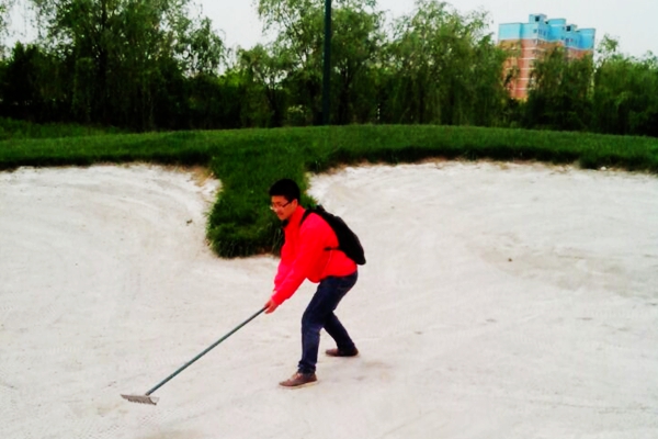 参观结束后,同学们在工作人员的指导下操作捡球车进行捡球,运用平耙抹平沙坑脚印,并在练习场地进行握杆、挥杆及击球等动作练习。