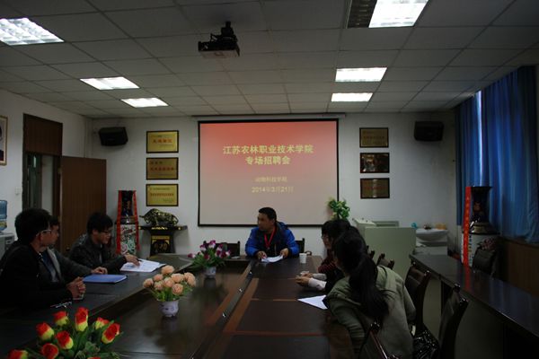 3月21日上午,学院在4号楼一层会议室举办江苏农林职业技术学院专场招聘会。学院党委副书记王晓娟、专兼职辅导员及动科、动医等学院2014届硕士毕业生10余人参加了此次招聘会。