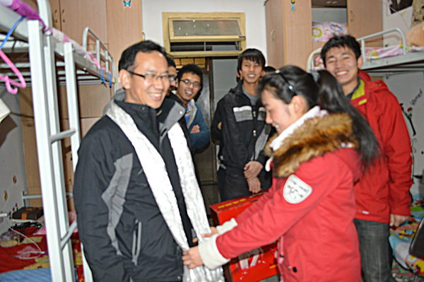 近日,学院党委书记闫祖书、党委副书记兼副院长王晓娟带领全体专兼职辅导员前往学生宿舍为贫困学生和少数民族学生发放冬寒物资,在寒冷的冬日为同学们带来了学院的温暖。