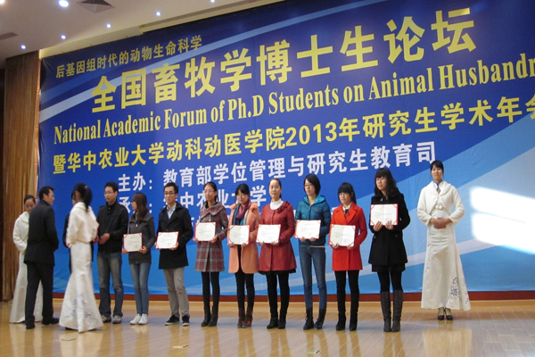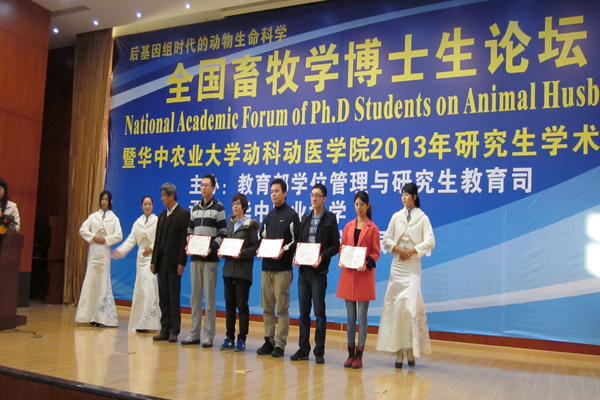 此次论坛我院2011级博士研究生徐瑶获得2013年全国畜牧学博士生学术论坛一等奖(共5名),2010级博士研究生贺花获得2013年全国畜牧学博士生学术论坛三等奖(共10名)。本届论坛共收到来自中国农业大学、西北农林科技大学、华南农业大学等国内著名高校100余篇论文摘要,88篇收编为会议论文摘要集。
