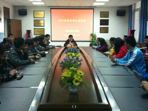 11月13日下午,我院在四号楼一层会议室召开了2014届保研学生座谈会。我院党委副书记兼副院长王晓娟,全体专兼职辅导员,以及全体2014届保研学生参加了此次座谈会。