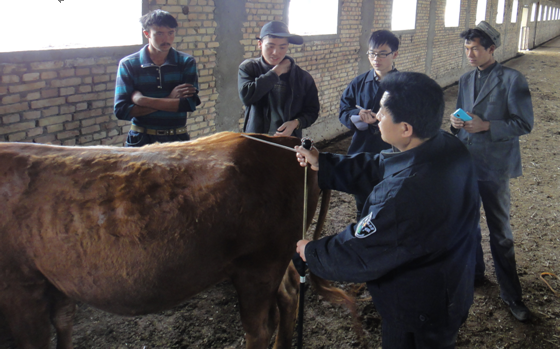 在喀什期间,昝林森教授还在地区畜牧兽医党委书记郭平的陪同下,与在当地调研畜牧生产工作的自治区畜牧厅副厅长木日扎等进行了座谈交流。辛亚平副教授带领本科毕业生宋宁深入疏勒县福润源肉牛繁育基地,对当地引进繁育的秦川牛及安秦、利秦杂交牛的生长发育情况进行了实际测定,为协助当地制定肉牛选育改良技术方案积累了基础数据。