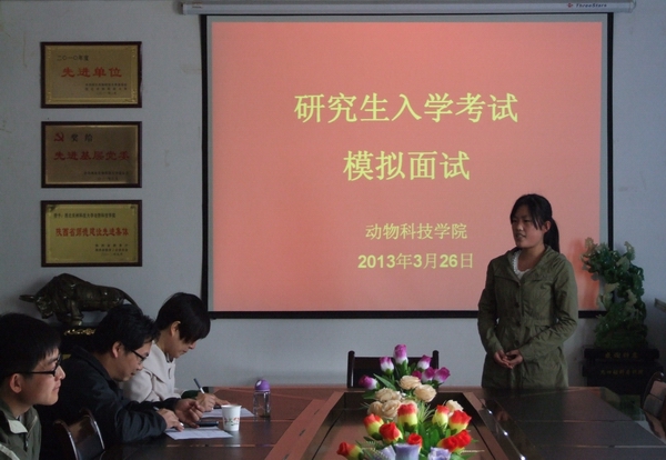 近期,我院分别在四号楼一层和二层会议举行了研究生复试模拟面试。此次模拟面试活动邀请到了动物科学系蓝贤勇老师、史新娥老师、草业科学系刘海侠老师和水产科学系杨培志老师、研究生秘书阮鹏老师作为面试评委。共有40多名2013届考研同学参加了本次模拟面试。学院副书记兼副院长王晓娟老师参加了活动。