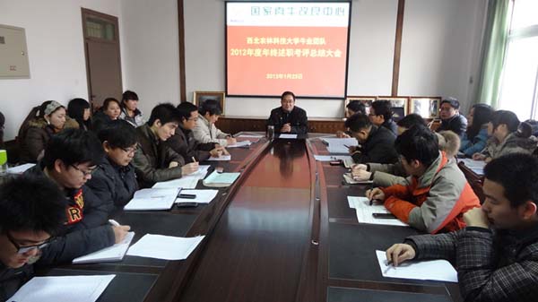 上午,昝林森教授在国家肉牛改良中心会议室主持召开了团队举行了2012年度师生员工年终述职考评总结会议。会上,团队专家昝林森教授、胡建宏教授、辛亚平副教授、赵春平讲师、王洪宝讲师、成功助理研究员、李安宁讲师、杨武才讲师主要从年度工作任务承担完成情况、工作亮点、在平台工作天数等方面进行了述职;二、三年级博硕士研究生分别汇报了各自的科研进展、论文发表、日常出勤等情况;三位科研辅助人员分别根据各自承担的任务作了工作汇报。期间,团队专家还现场查看了研究生的科研日志和实验记录等。述职期间,师生员工每人按百分制对所有汇报人员通过无记名打分进行了绩效测评。