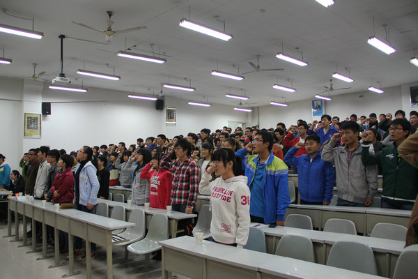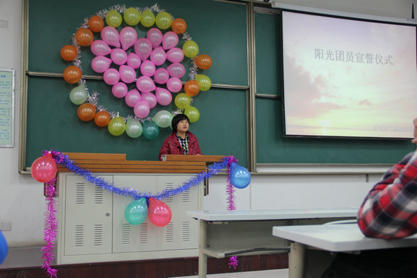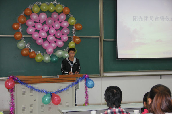 宣誓仪式在郭婷老师铿锵有力的讲话中开始,她简洁而有深意的讲话给予了在场所有阳光团员极大的鼓舞,老师还要求大家在今后的学习生活中能够以身作则,自强不息,并为其他学生做好表率。接下来,阳光团工委副书记石长沅做了发言,他以自己的亲身经历与大家分享了学会感恩与奉献社会的重要性。随后,阳光团工委动科支部负责人邓昌海,上届优秀团员代表王星星,以及新团员代表李亚新分别做了发言。最后,在优秀阳光团员代表任发的带领下,2012届阳光团员完成了庄严地宣誓,“自强不息,奋斗不息!”的口号响彻整个教室。