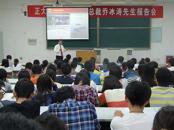 乔冰涛先生通过大量的数据和图片,展示了正大集团雄厚的实力、优雅的工作环境、现代化的养殖设备和先进的管理模式,并重点向同学们介绍了现代农业发展的理念。同时,他还结合自己学习和工作的经历,鼓励同学们努力学习,毕业后走向更加广阔的平台。
