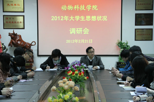2月21日下午,我院在四号楼一层会议室召开2012年大学生思想状况调研会。院党委书记闫祖书、党委副书记兼副院长王晓娟、辅导员老师以及我院各年级的班长、团支书参加了会议。会议由王晓娟副书记主持。