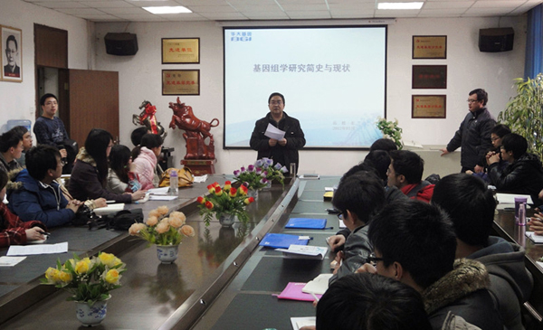 会上,岳桂东博士结合多个动植物测序过程的经典案例,讲解了基因组学研究的起步、发展和兴起几个阶段,向大家介绍了MPSS、Polony Sequencing、454 焦磷酸测序、Illumina (Solexa) sequencin等基于高通量测序技术的各种基因组学研究手段,重点介绍了高通量测序技术在基因组从头测序和重测序中的应用情况,系统阐述了目前高通量测序技术在基因组学研究中的研究方法与技术路线。在互动交流环节,岳博士热情地回答了师生们提出的问题。