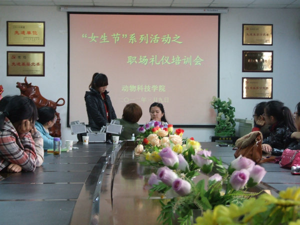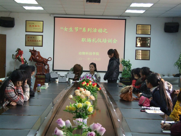 3月9日下午,四号楼一层会议室座无虚席,来自北京薇薇新娘杨凌分店的两位化妆师作了一场别开生面的职场礼仪培训会。我院本硕40多位女生参加了培训会,党委副书记兼副院长王晓娟出席并主持此次会议。
