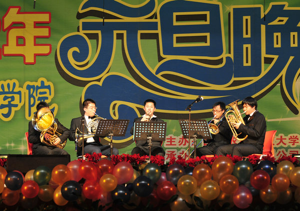 教工子女阮凌宇小朋友和她的伙伴为大家演奏《彩云追月》、《我的祖国》