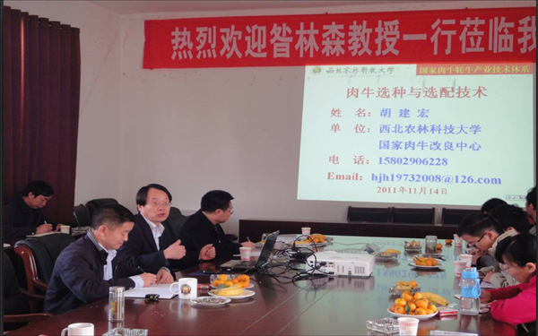 11月12~14日,国家肉牛牦牛产业技术体系岗位专家、副院长昝林森教授率领团队专家胡建宏副教授、王洪宝博士赴云南省草地动物科学研究院进行技术对接,就BMY牛选育改良及产业化工程开展调研指导和技术培训工作。期间,昝林森教授一行在云南省草地动物科学研究院院长黄必志研究员和国家肉牛牦牛产业技术体系昆明综合试验站站长张继才副研究员等的陪同下,参观了胚胎工程实验室、高营养糖蜜舔砖产品、肉牛屠宰中试车间和肉牛饲料加工厂,实际查看调研了婆罗门种公牛、BMY种公牛、BMY青年及后备母牛、断奶犊牛、大额牛及杂交后代等不同种群牛选育和饲养情况,在充分肯定该院目前科研工作进展的同时,昝林森教授还就进一步加强BMY牛选育、规范饲养管理、促进产业化开发等议题与黄必志岗位专家及团队成员、张继才站长及团队成员进行了交流,双方就高营养糖蜜舔砖产品在北方肉牛生产中进行中试推广达成了共识。结合此次调研工作,昝林森教授和胡建宏副教授还在云南省草地动物科学研究院为当地科技人员和肉牛企业技术人员分别做了题为“中国黄牛肉用改良的思路与方法”和“肉牛选种选配与繁殖技术”的专题讲座。