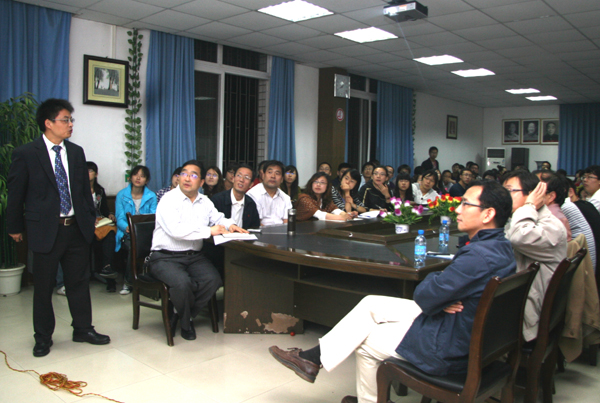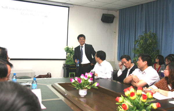 吴鑫博士从精原干细胞的提取、分析、保存、利用等方面为与会师生详细介绍了他在宾夕法尼亚大学Ralph Brinster博士实验室和韦恩州立大学Alexander Gow 博士实验室从事的雄性支持细胞紧密连接蛋白claudin11的转基因研究和雄性生殖干细胞研究工作,受到师生的热烈欢迎。
