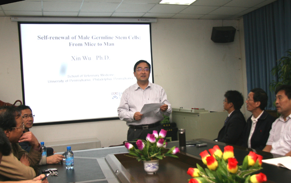 9月14日晚,来自美国宾夕法尼亚大学的吴鑫博士在学院一楼会议室为师生做了题为“Self-renewal of male germ line stem cell from mice to man”的学术报告,学院教授委员会委员及相关专业师生70多人参加了会议,副院长昝林森教授主持报告会。