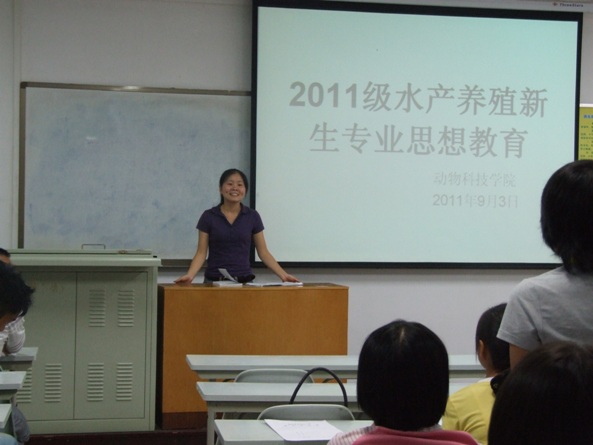 9月3日晚,我院水产科学系在八号教学楼召开新生入学教育活动。水产科学系熊冬梅老师、教学秘书郭超老师及优秀学生代表张超同学出席了此次报告会。