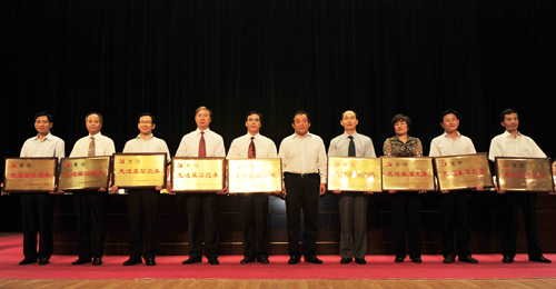 樵淑银、巩敏芝代表获奖先进党支部上台领奖(图右四、三)