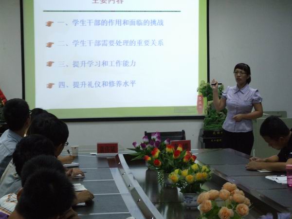 李娜老师结合学校学生干部的实际情况,分别就“学生干部的作用和面临的挑战”、“学生干部需要处理的重要关系”、“提升学习和工作能力”、“提升礼仪和修养水平”四个方面展开讲解;并提出了多读书、读好书的建议。希望学生干部正确认识自我,增强责任感,在广大学生中起先锋模范带头作用;培养公仆意识,强化服务意识,增强团队意识,淡化“干部”意识。李老师引经据典,旁征博引,以通俗的事例、幽默的语言赢得在场热烈而持久的掌声。